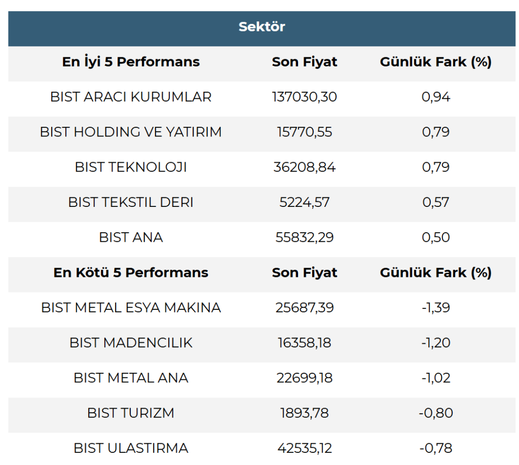 Sektör görünümlerinde ilk yarıda genel olarak negatif seyrin hakim olduğu görülmektedir. En iyi performans sergileyen sektör(ler) Aracı Kurumlar ve Holding ve Yatırım iken baskı görenlerde Metal Eşya Makina ve Madencilik dikkat çekmektedir.