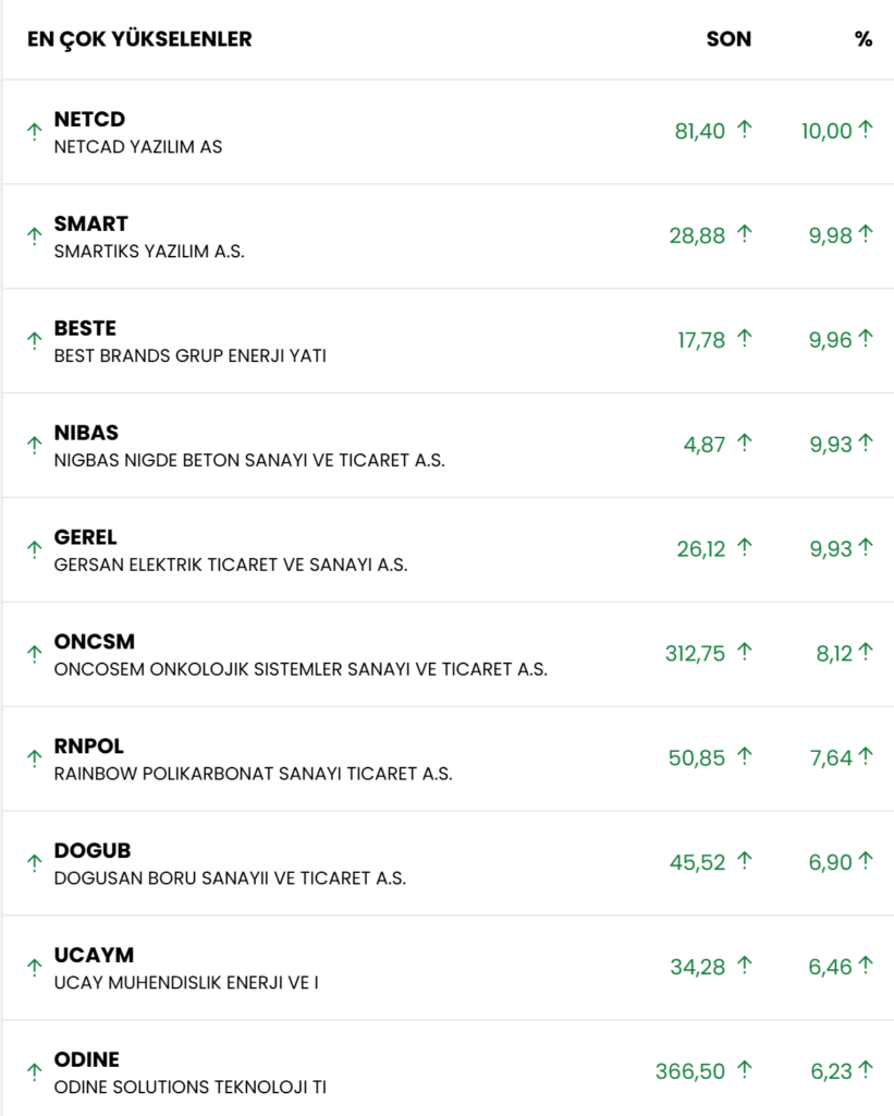 Günün en çok kazandıran hissesi %10,00 artış gösteren NETCD oldu. Onu %9,98 yükselişle SMART ve %9,96 yükselişle BESTE hisseleri takip etti. NIBAS ve GEREL hisseleri %9,93 oranında değer kazanırken, ONCSM %8,12 ve RNPOL %7,64 oranında yükseliş kaydetti.