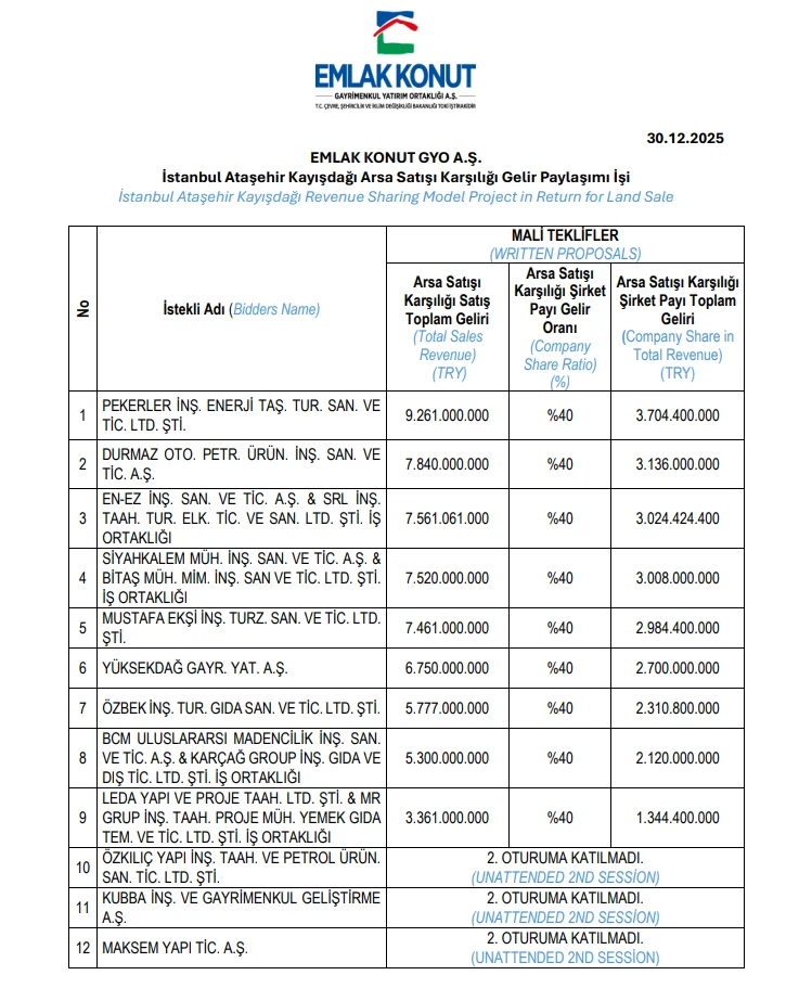 İhaleye katılan istekliler ve sundukları tekliflere ilişkin detayların değerlendirme sürecinin sürdüğü belirtildi. Emlak Konut GYO, ihalenin nihai olarak sonuçlanmasının ardından kamuoyunun ayrıca bilgilendirileceğini açıkladı.