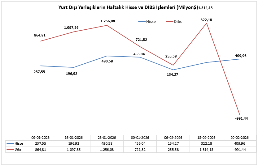 TCMB tarafından açıklanan 16 – 20 Şubat 2026 haftasına dair Haftalık Menkul Kıymet İstatistikleri verilerine göre, yurt dışında yerleşik kişilerin piyasa fiyatı ve kur hareketlerinden arındırılmış hisse senetleri net değişimi 409 milyon 960 bin dolar giriş yönünde gerçekleşti. Aynı hafta içerisinde yurt dışı yerleşiklerin piyasa fiyatı ve kur hareketlerinden arındırılmış DİBS (Kesin Alım) net değişimi ise -991 milyon 440 bin dolar olarak kaydedildi.