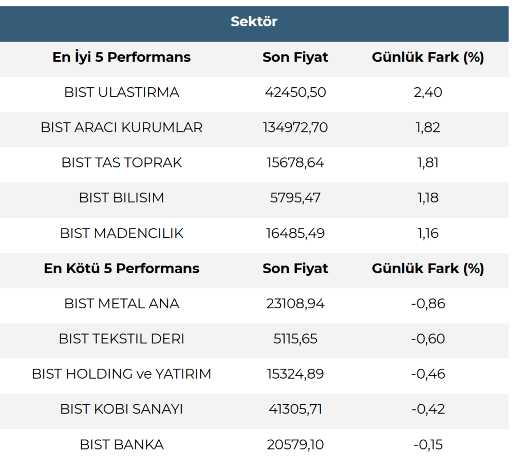 Sektör görünümlerinde ilk yarıda genel olarak pozitif seyrin hakim olduğu görülmektedir. En iyi performans sergileyen sektör(ler) Ulaştırma, Aracı Kurumlar ve Taş Toprak iken baskı görenlerde Metal Ana, Tekstil Deri ve Holding Yatırım dikkat çekmektedir.