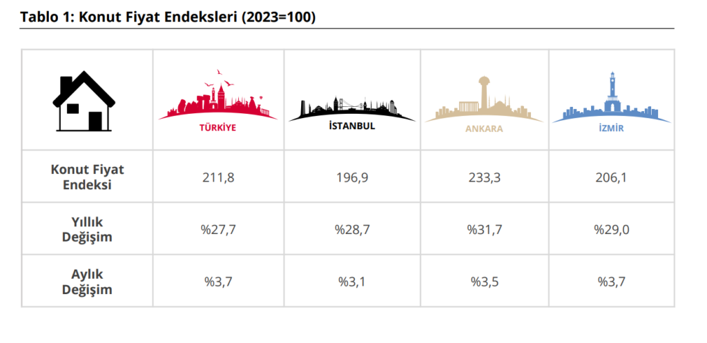 Geçen yılın aynı ayına göre yıllık fiyat artışları ise İstanbul’da yüzde 28,7, Ankara’da yüzde 31,7 ve İzmir’de yüzde 29,0 olarak gerçekleşmiştir. Türkiye genelinde yıllık bazda konut fiyatlarının en çok yükseldiği bölge yüzde 34,2 ile Bingöl, Elazığ, Malatya, Tunceli, Van, Bitlis, Hakkâri ve Muş illerini kapsayan bölge olurken; en düşük yıllık artış yüzde 18,2 ile Edirne, Kırklareli ve Tekirdağ bölgesinde ölçülmüştür.
