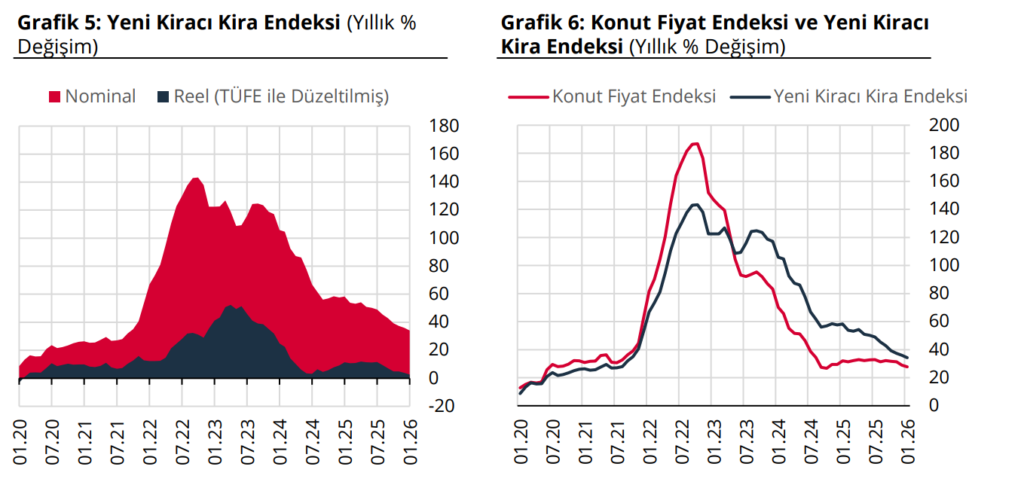 Yeni kiracı kira fiyatlarını takip eden Yeni Kiracı Kira Endeksi (YKKE) ise Ocak 2026’da bir önceki aya göre yüzde 3,5 oranında artarak 293,6 seviyesine gelmiştir. Bu endeks yıllık bazda nominal olarak yüzde 34,2, reel olarak ise yüzde 2,7 oranında yükselmiştir.