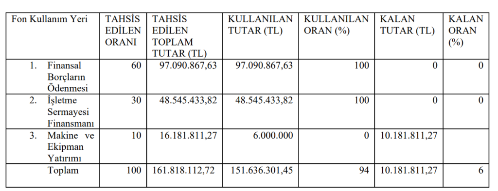 Halka arzdan gelen fonun toplamda %94’ü amaçlarına uygun olarak harcandı. Makine ve ekipman yatırımı için ayrılan ancak henüz kullanılmayan 10.181.811,27 TL’lik kısım ise banka hesaplarında değerlendiriliyor. Şirket, borç ödeme ve işletme sermayesi hedeflerine tamamen ulaştığını belirtti.