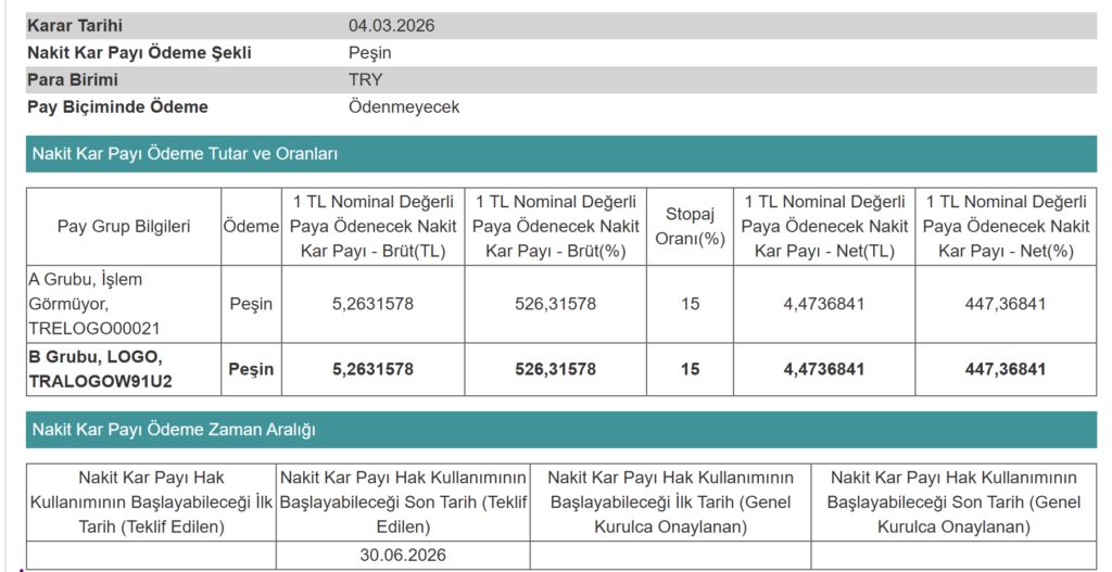 Logo Yazılım yönetim kurulu, 4 Mart 2026 tarihinde nakit kar payı ödenmesine dair karar almıştır. Şirket, kar payı ödemelerinin peşin olarak yapılacağını belirtmiştir. Ödemelerin para birimi Türk Lirası (TRY) olarak belirlenmiştir.