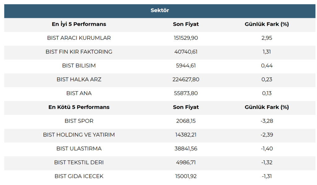 Sektör görünümlerinde ilk yarıda genel olarak negatif seyrin hakim olduğu görülmektedir. En iyi performans sergileyen sektör(ler) Aracı Kurumlar, Finansal Kiralama Faktoring ve Bilişim iken baskı görenlerde Spor, Holding ve Yatırım ve Ulaştırma dikkat çekmektedir.