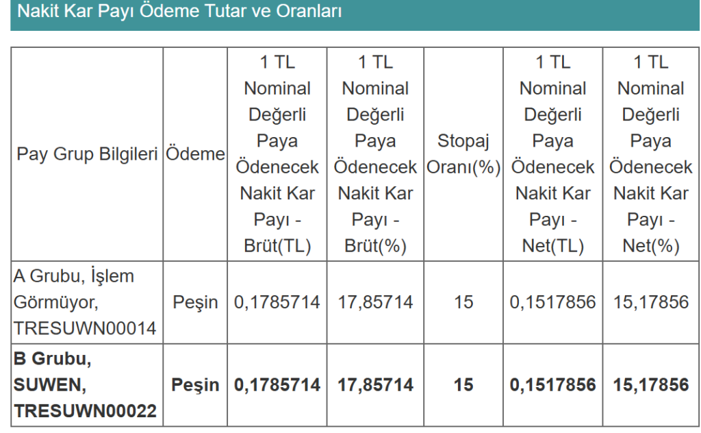 2 Mart 2026 tarihinde önemli bir açıklama yayınlandı. Suwen Tekstil Sanayi pazarlama Anonim Şirketi yeni bir gelişmeye kamu aydınlatma platformunda yayınladı. şirket 2 Mart 2026 tarihli genel kurul toplantısında bir karar aldığını açıkladı. alınan karar temettü dağıtıma kararlıydı. Şirket 1 TL nominal değerli paya nakit brüt 0.1785 TL net ise 0,1517 ödeyecek.