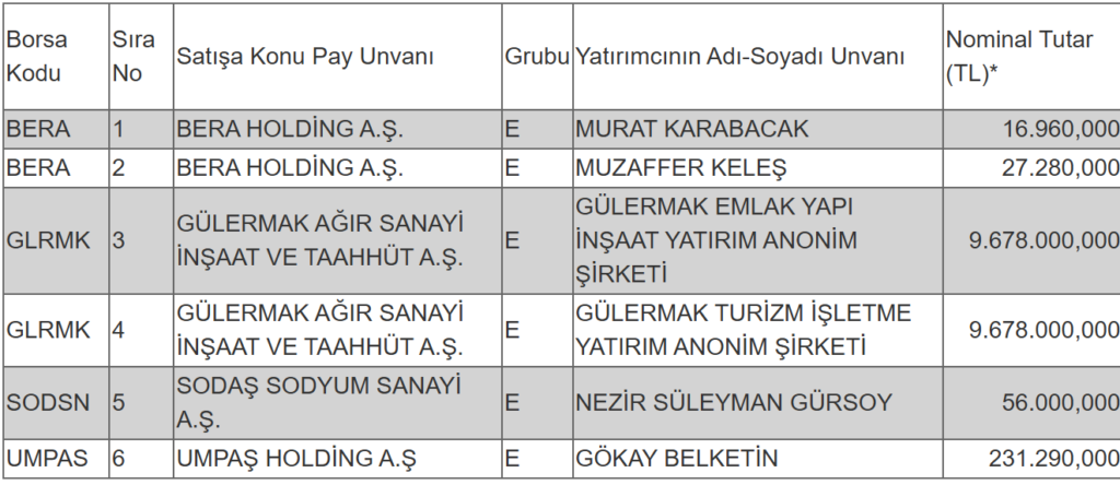 Bu işleme konu olan bir şirket oldu. Bu şirket, GÜLERMAK AĞIR SANAYİ İNŞAAT VE TAAHHÜT A.Ş. olurken, çeşitli yatırımcılar E tipi işlem görmeyen paylarının bir miktarını borsada işlem gören tipe dönüştürmek için başvuru yaptı.