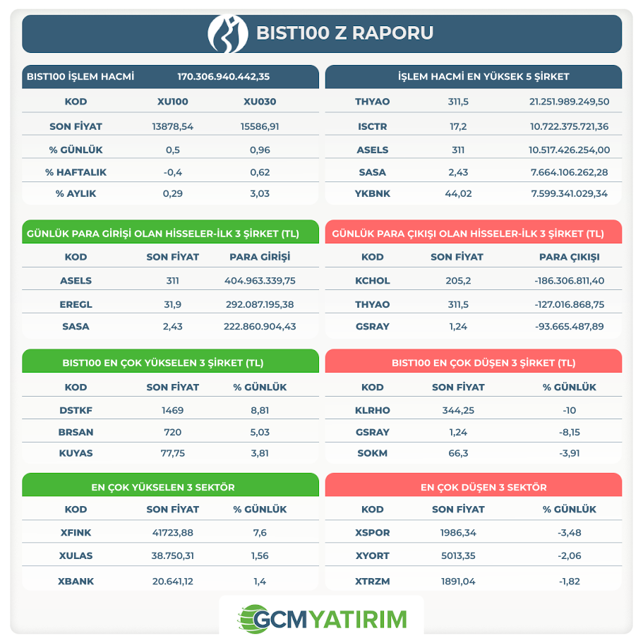 BIST100 endeksi günü 13.878,54 puandan kapatarak günlük bazda %0,5 oranında yükseliş göstermiştir. Toplam işlem hacmi ise 170.306.940.442,35 TL olarak gerçekleşmiştir. İşlem hacmi bakımından ilk sırada THYAO yer alırken, onu sırasıyla ISCTR, ASELS, SASA ve YKBNK takip etmiştir.