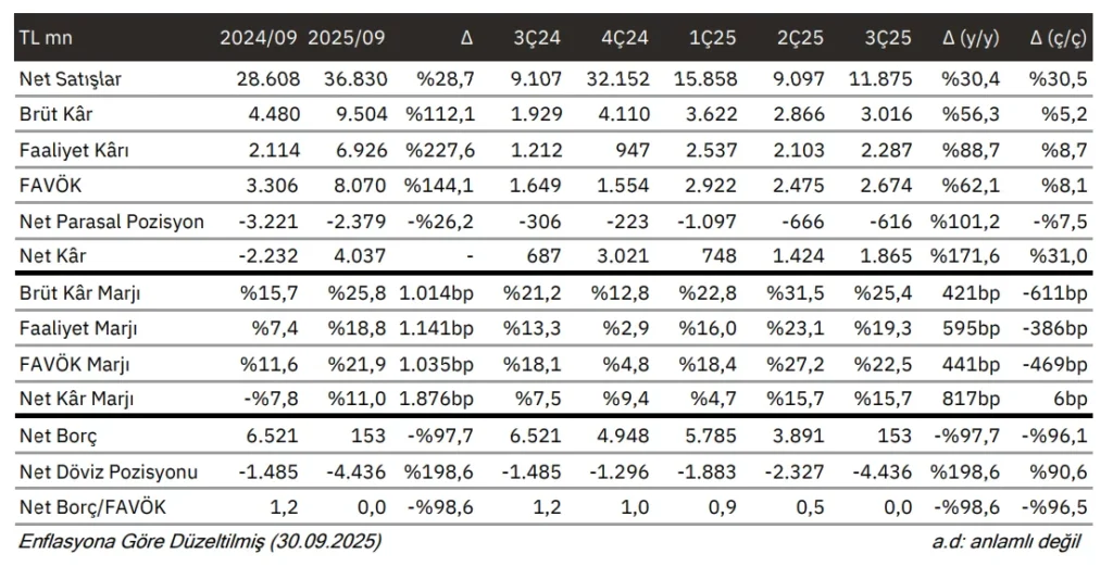 2025’in ilk 9 ayında ise net satışlar yıllık bazda %28,74 artışla 36,83 milyar TL olarak gerçekleşti.