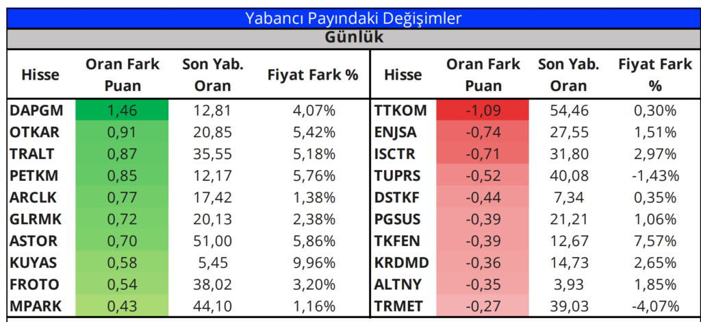 Günlük verilere göre yabancı payı en çok artan hisse 1,46 puanlık değişimle DAPGM oldu. Bu hisseyi 0,91 puan artışla OTKAR ve 0,87 puan artışla TRALT takip etti. Listede öne çıkan diğer şirketler arasında PETKM 0,85 puan, ARCLK 0,77 puan ve GLRMK 0,72 puanlık yabancı payı artışı yaşadı. Ayrıca ASTOR, KUYAS, FROTO ve MPARK hisselerinde de yabancı payı oranlarının yükseldiği görüldü.