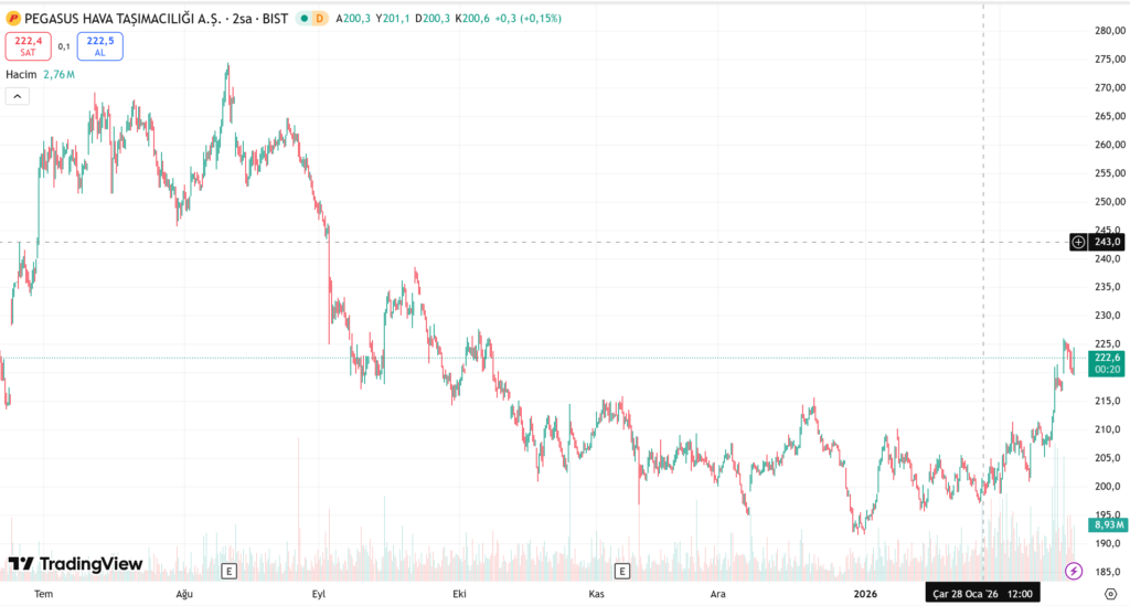 Pegasus Hava Yolları 17 Şubat 2026 tarihinde kapanışını yüzde 0,18’lik düşüş ile yaptı. Hissenin güncel fiyatı 223,60 TL olarak görünüyor. Hisse son 5 gününde yatırımcısına yüzde 8,63 kazandırdı. Son 1 ayda ise bu yükseliş yüzde 10 oranında göründü. Hava Yolları şirketi son 6 ayda yüzde 12,63’lük bir değer kaybı yaşadı. 6 ay önce hissenin değeri 261 TL idi. 2026 yılında ise yani 1,5 aylık süreçte Hava Yolları şirketi yüzde 15 oranında değer kazandı.