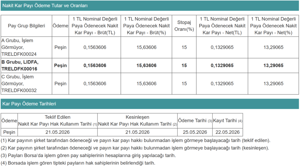Lider Faktoring A.Ş. (LIDFA), pay sahiplerine yönelik 2025 yılı kar payı dağıtım detaylarını ve ödeme tarihlerini duyurdu. Şirket tarafından paylaşılan tabloya göre, farklı pay grupları için belirlenen temettü tutarları netleşti.