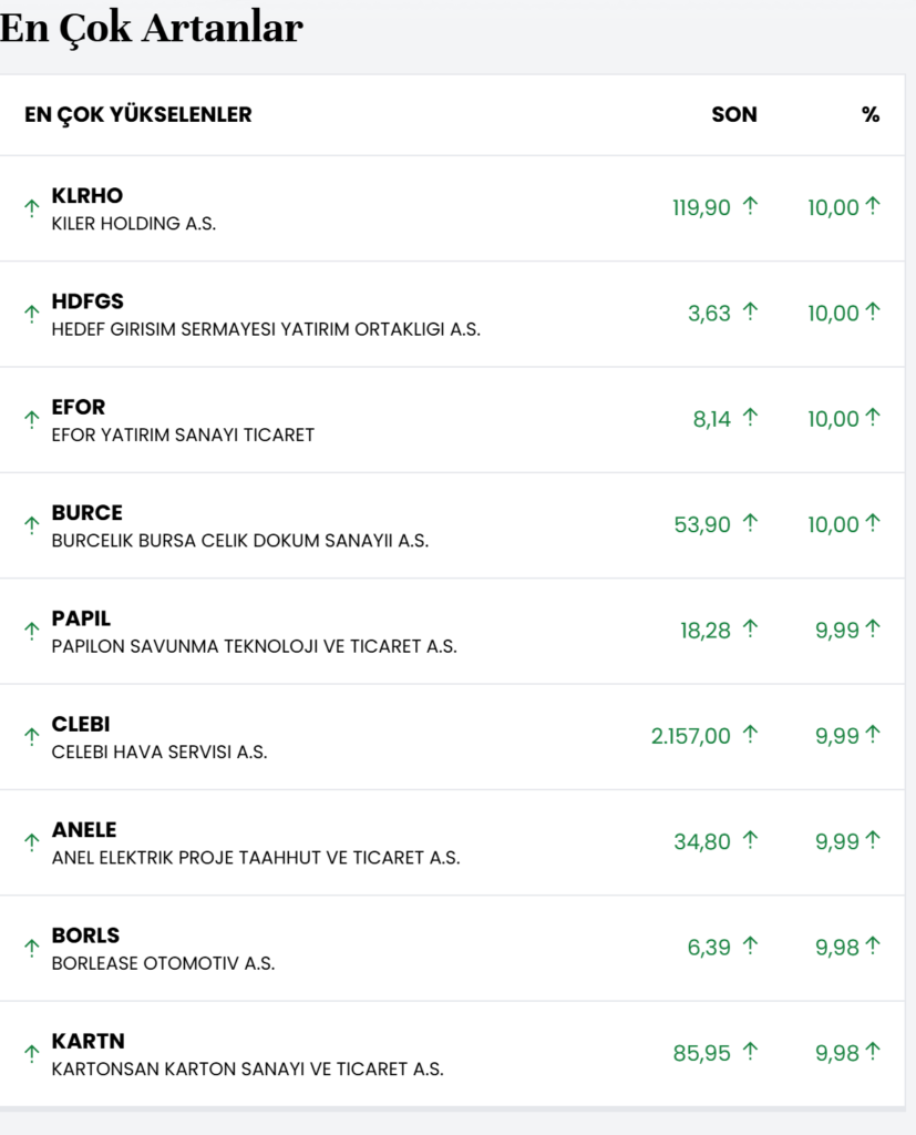 Borsa İstanbul’da günün en çok değer kazanan hisseleri belli oldu. Pay piyasasında KLRHO, HDFGS, EFOR ve BURCE hisseleri %10,00 oranında artış göstererek tavan fiyatlara ulaştı. Bu isimleri %9,99 yükselişle PAPIL, CLEBI ve ANELE takip etti. Listenin üst sıralarında yer alan diğer hisseler ise %9,98 prim yapan BORLS ve KARTN oldu.ü