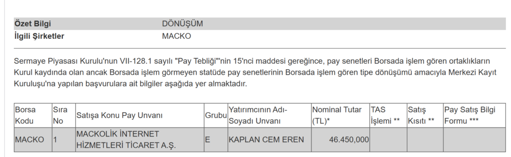 Bu işleme konu olan bir şirket oldu. Bu şirket, MACKOLİK İNTERNET HİZMETLERİ TİCARET A.Ş. olurken, çeşitli yatırımcılar E tipi işlem görmeyen paylarının bir miktarını borsada işlem gören tipe dönüştürmek için başvuru yaptı.