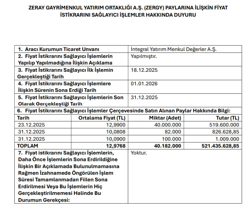 Açıklamaya göre Zeray GYO’nun halka arz edilen payları, 18 Aralık 2025 itibarıyla Borsa İstanbul Yıldız Pazar’da işlem görmeye başladı. Halka arz izahnamesinde belirtilen çerçevede, İntegral Yatırım aracılığıyla yürütülmesi planlanan fiyat istikrarı uygulamaları için öngörülen süre 15 gün olarak belirlenmişti.