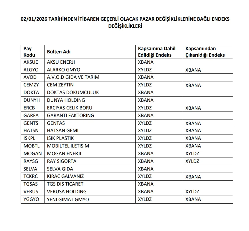 Borsa İstanbul, 2 Ocak 2026 itibarıyla 19 hisse için endeks değişikliği yapılacağını açıkladı.