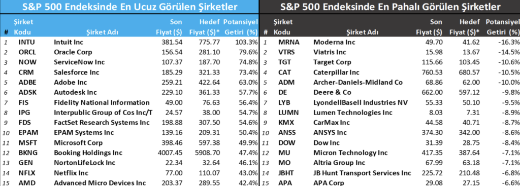 Bloomberg’de paylaşılan analist beklentilerine göre, potansiyel getiri oranlarına göre en ucuz görülen 15 şirketi ve yine potansiyellerine göre en pahalı görülen 15 şirketi aşağıdaki tablolarda paylaşıyoruz. Buradaki şirketler, belli bir piyasa değeri üzerindeki şirketler arasından filtrelenmiştir. Veriler, Bloomberg’de paylaşılan ortalama analist hedef fiyatlarını ve potansiyellerini yansıtmaktadır.