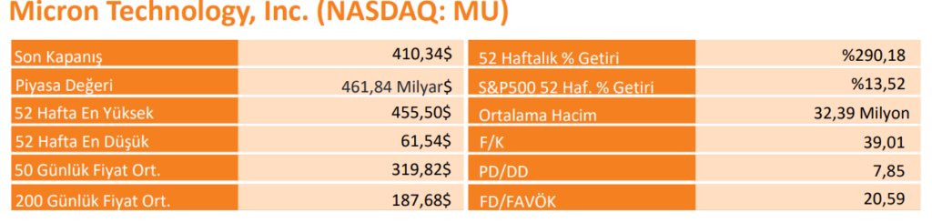 Raporda, 395,50 dolar seviyesinin altı zarar kes noktası olarak belirlenirken, yukarı yönlü hareketlerde 480 dolar ve 500 dolar seviyelerinin hedeflenebileceği ifade edildi. Micron hissesinin son kapanış fiyatı 410,34 dolar, 52 haftalık getirisi ise %290,18 olarak kaydedildi.