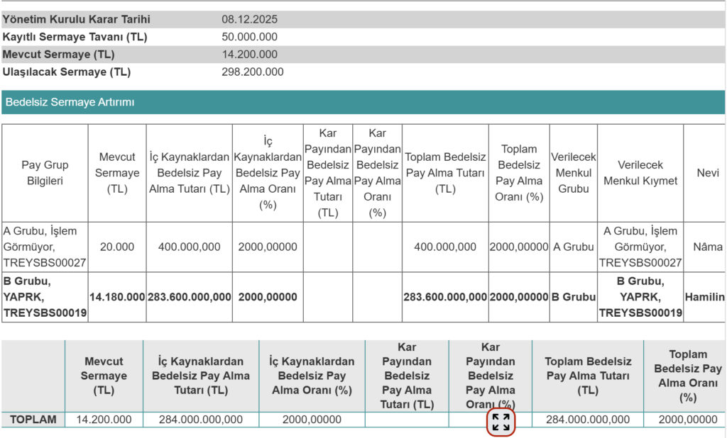 Yeni sermaye yapısında A grubu paylar için 400.000.000 TL, B grubu (YAPRK) paylar için ise 283.600.000 TL bedelsiz pay alma tutarı belirlendi. Sürecin tamamlanmasıyla birlikte şirketin kayıtlı sermaye tavanı 50.000.000 TL olarak belirtilen sınırın üzerine çıkmış oldu.
