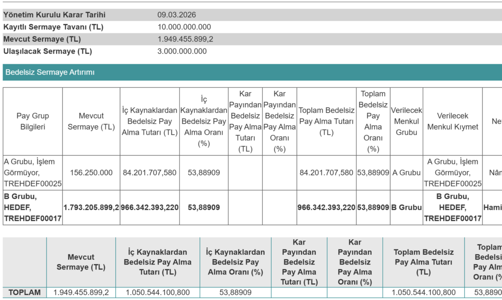 - B Grubu Paylar (HEDEF): 1.793.205.899,2 TL olan mevcut sermaye tutarına karşılık 966.342.393,22 TL tutarında bedelsiz pay verilecektir.