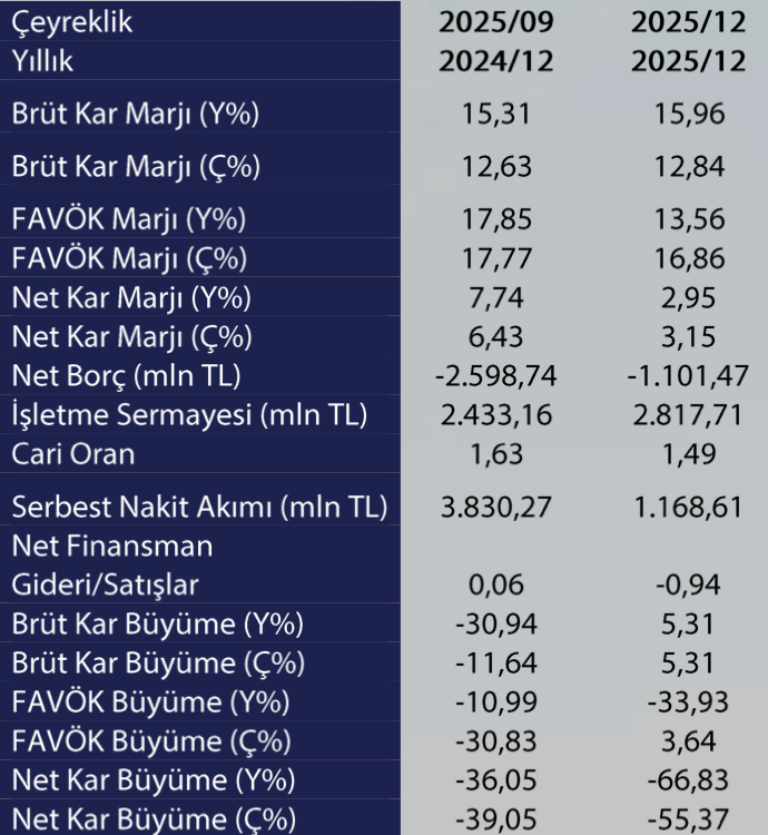 Operasyonel toparlanma çabası var. 2025 4.çeyrekte FAVÖK 1,19 milyar TL’ye ulaştı (çeyreklik %5 artış) ve FAVÖK marjı %19 olarak gerçekleşti. Bu iyileşme; seçici fiyat ayarlamaları, optimize edilen satış karması ve güçlü maliyet disiplini sayesinde sağlandı. Yıl genelinde FAVÖK 3,34 milyar TL ile %34 geriledi. Bu düşüş; enflasyonist maliyet baskıları ve zayıf talep ortamını yansıtıyor.