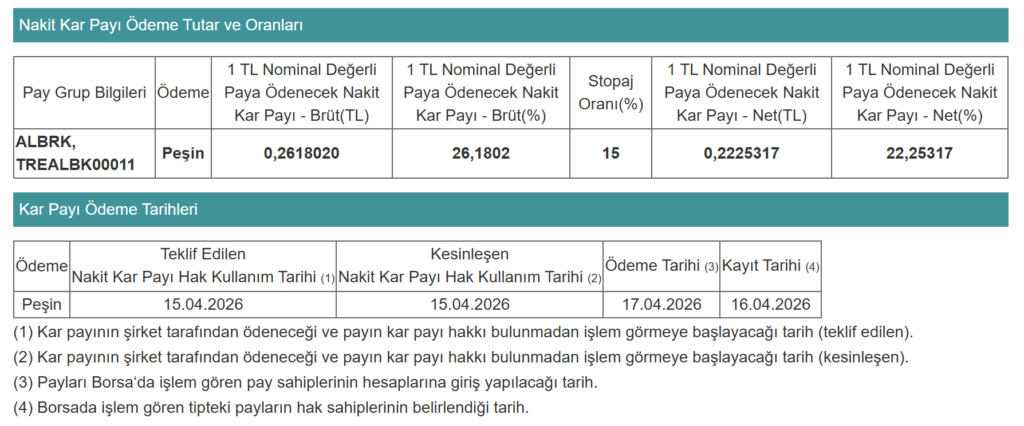 Kâr payı dağıtım süreci Nisan ayı içerisinde gerçekleşecektir. Nakit kâr payı hak kullanım tarihi 15 Nisan 2026 olarak kesinleşmiştir. Borsada işlem gören tipteki payların hak sahiplerinin belirlendiği kayıt tarihi ise 16 Nisan 2026’dır.