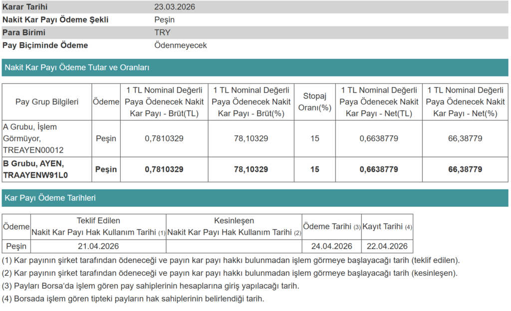 Ayen Enerji, 23 Mart 2026 tarihinde aldığı yönetim kurulu kararı ile ortaklarına nakit temettü ödemesi yapacağını duyurdu. Şirket, kar payı ödemelerinin nakit ve peşin olarak gerçekleştirilmesine karar verdi.