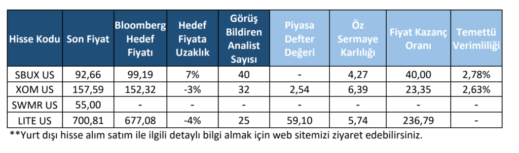 Meksa Yatırım tarafından yayımlanan yurt dışı hisse senedi bülteninde yer alan önemli gelişmeler aşağıda sunulmuştur. Bu bültende Starbucks, ExxonMobil, Swarmer Inc ve Lumentum Holdings şirketlerine dair güncel piyasa analizleri ve operasyonel veriler yer almaktadır.